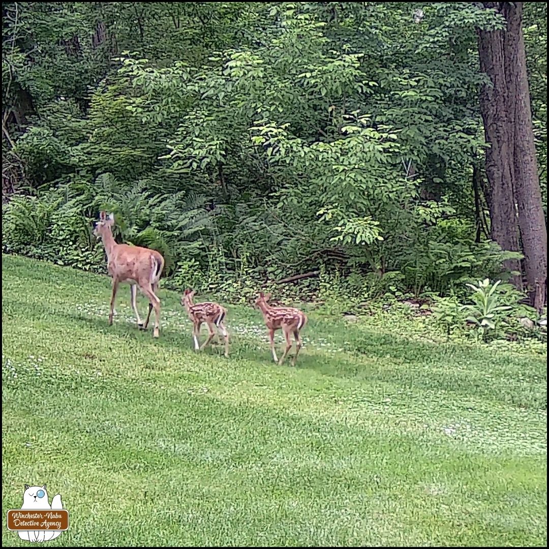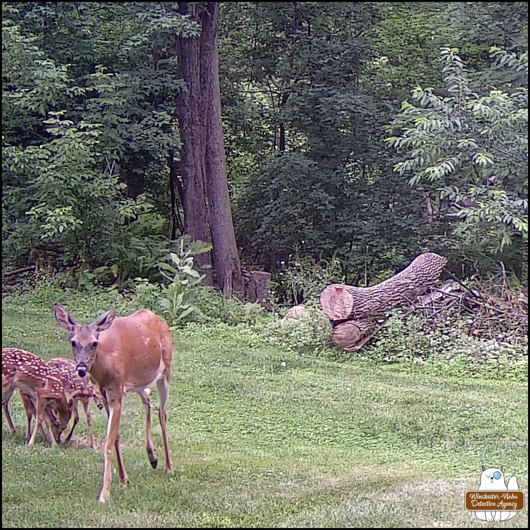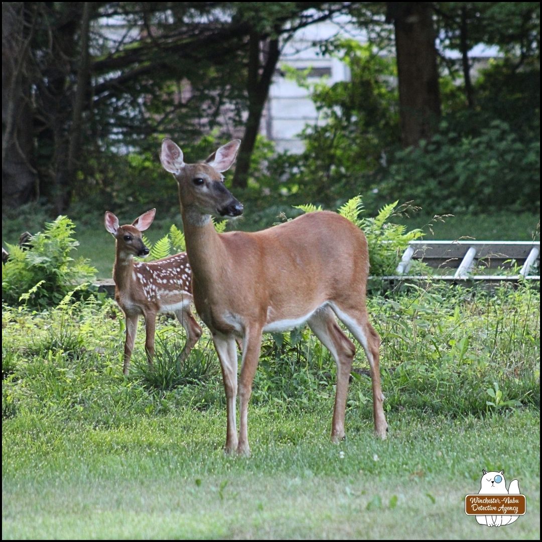By this point, Oliver and Gus has already introduced themselves to a deer who didn’t have any fawns with her in mid-June (seen in the video). One of the deer creatures showed a limp on June 16th, the same day we had that up-close encounter. Injuries have been seen more often this summer than any previous summer. We aren’t counting deaths in this as there are always many from vehicle collisions. Seeing male and female deer with survivable injuries when it’s not rutting seasons, leaves the cat detectives wondering what’s going on.