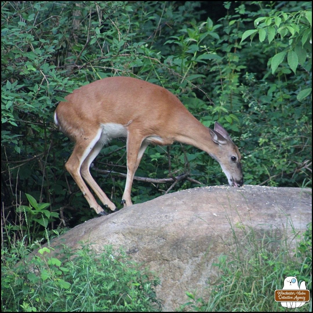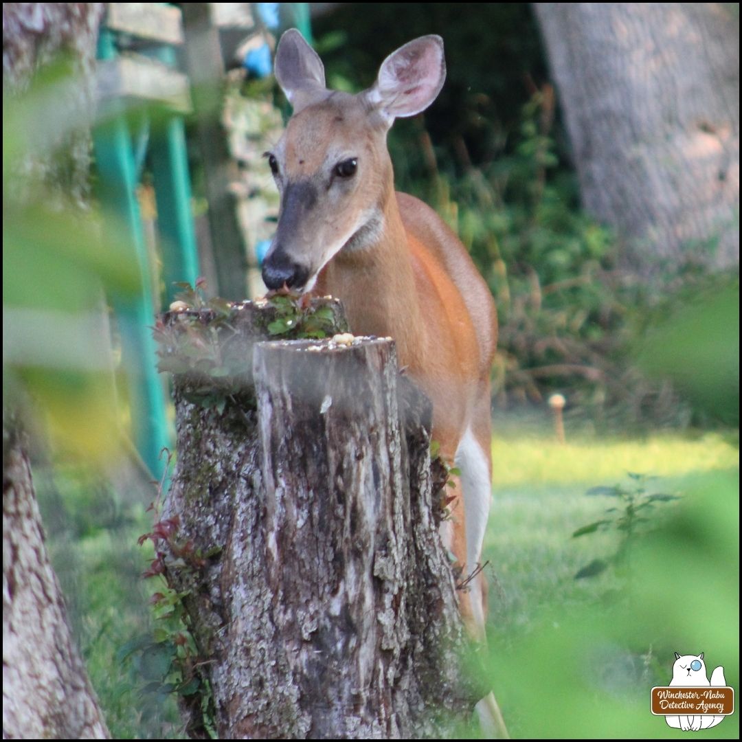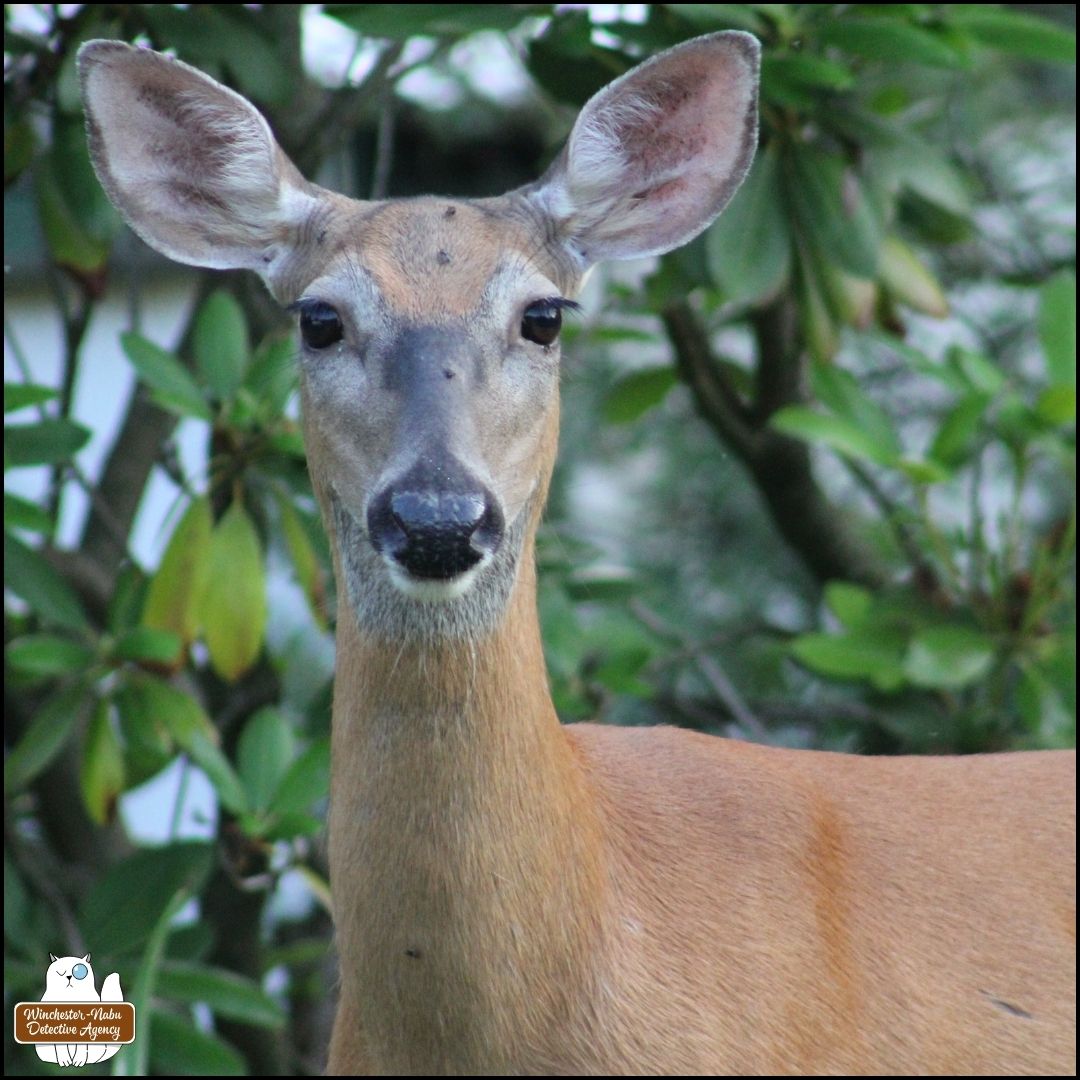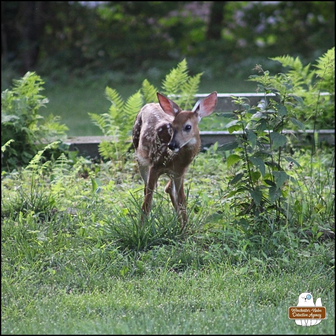 By this point, Oliver and Gus has already introduced themselves to a deer who didn’t have any fawns with her in mid-June (seen in the video). One of the deer creatures showed a limp on June 16th, the same day we had that up-close encounter. Injuries have been seen more often this summer than any previous summer. We aren’t counting deaths in this as there are always many from vehicle collisions. Seeing male and female deer with survivable injuries when it’s not rutting seasons, leaves the cat detectives wondering what’s going on.