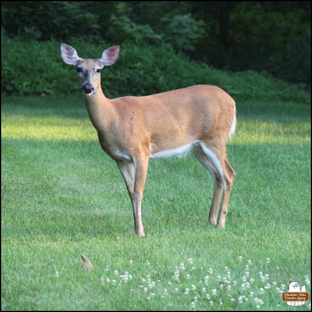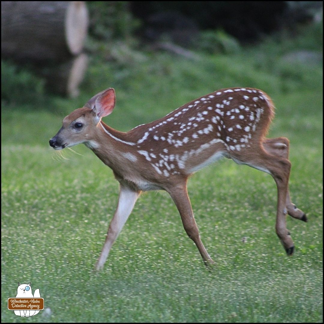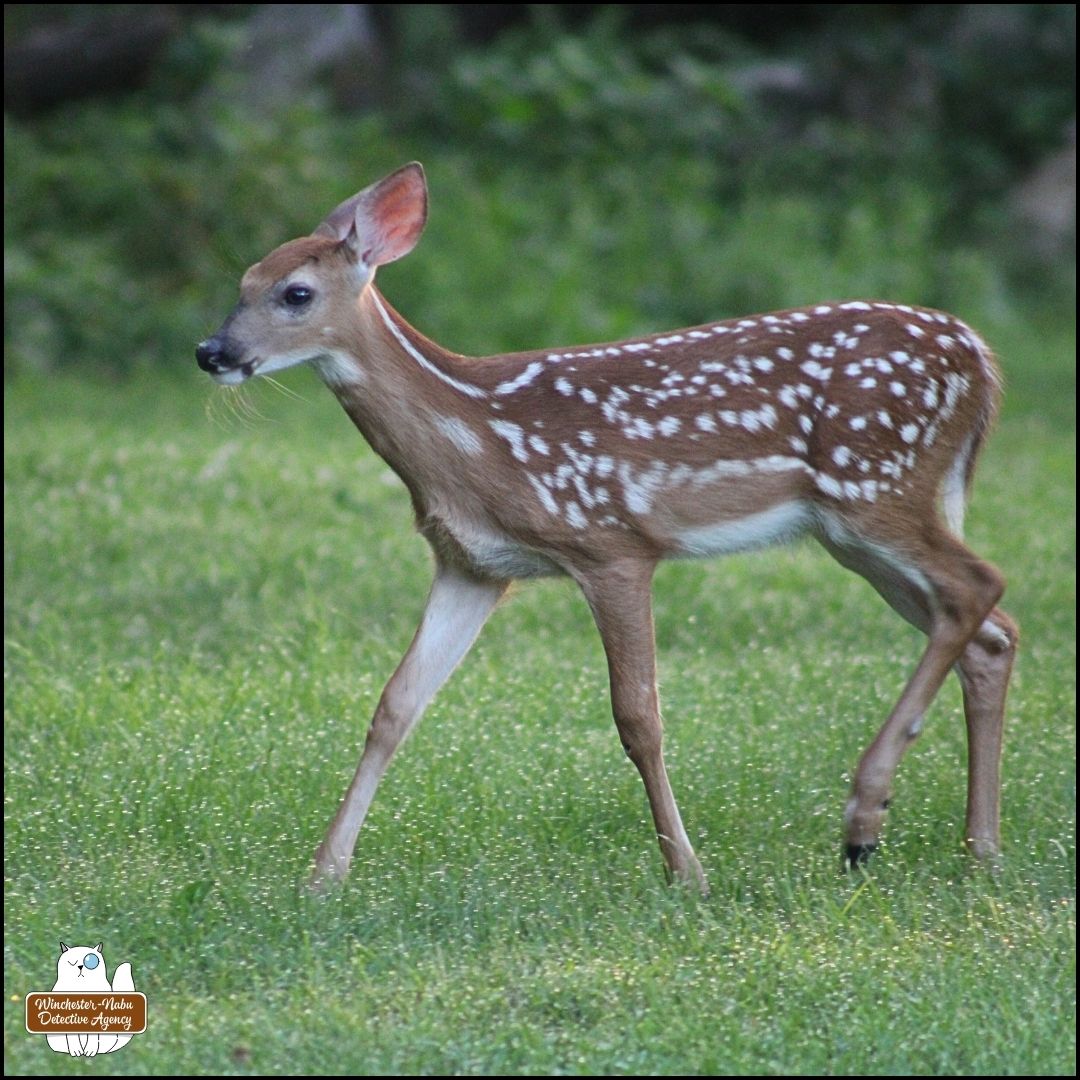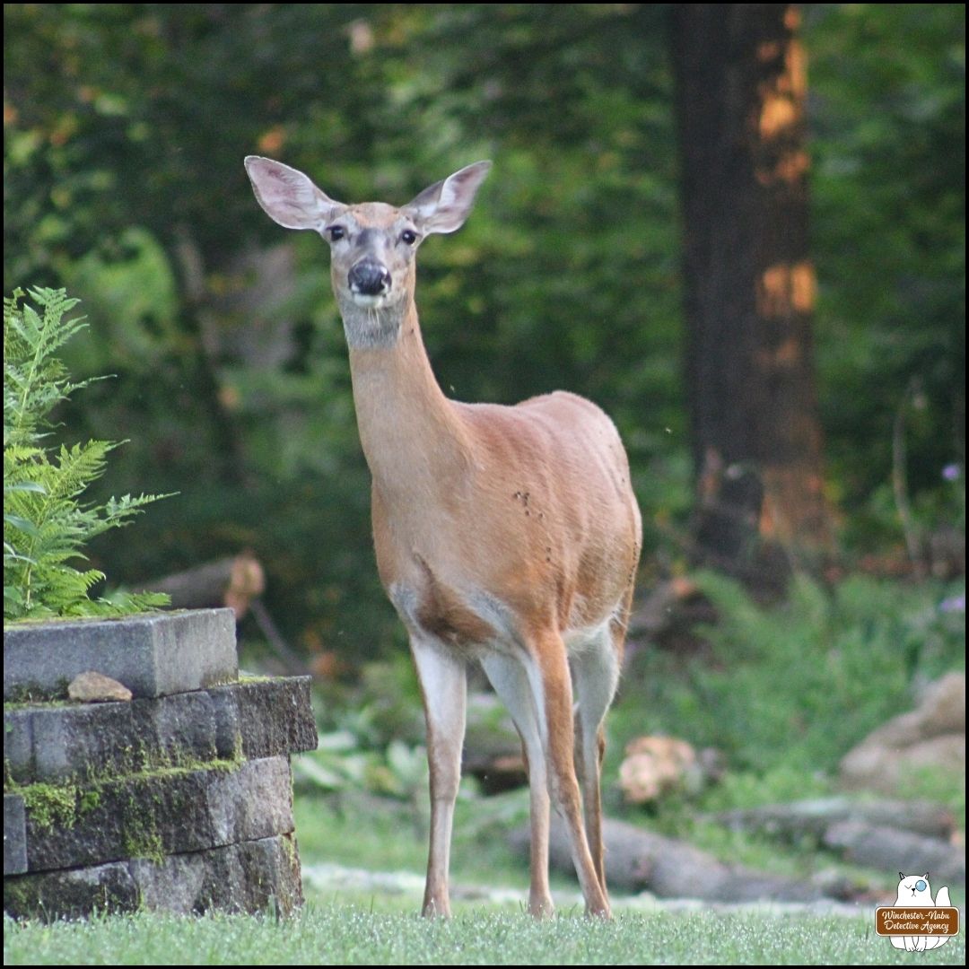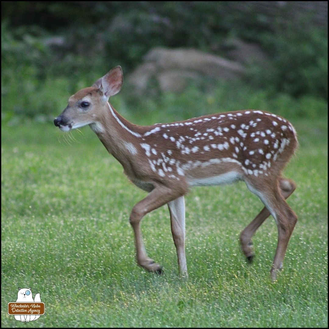 There’s a doe with three fawns; a doe with two fawns; a doe with one fawn (Deerdra and Sheelin); and a doe with no fawns (anymore). A fawn was found on the highway nearby, deceased apparently from a vehicle collision. We don’t know if that baby belonged to any of the deer or devil-deer that frequent the estate grounds. It’s only an assumption at this point. It might also be some sort of explanation about why one older doe who shows up without any fawns feels the need to stalk and attack the doe with one fawn.