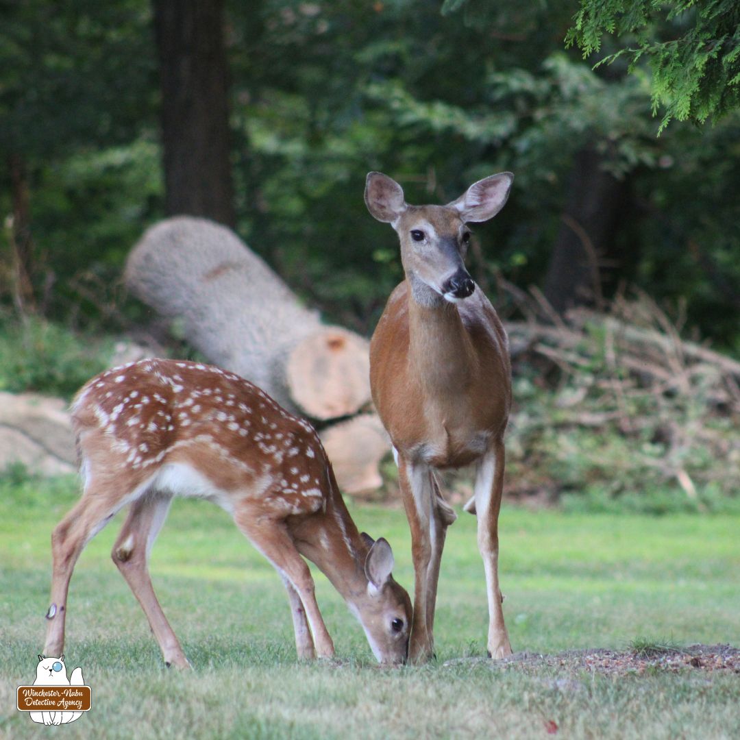 Gus watched his partner engage in conversation with the mother deer. Then he distracted himself by watching the birds and squirrels at Gnome Grove. We had two new gnomes on staff, Ninome and Raphael, who have adjusted well to their new roles here at the Winchester-Nabu Detective Agency. The whirlwind that is the eastern grey squirrel, Jessica Walnuts, had already attacked Ninome once.