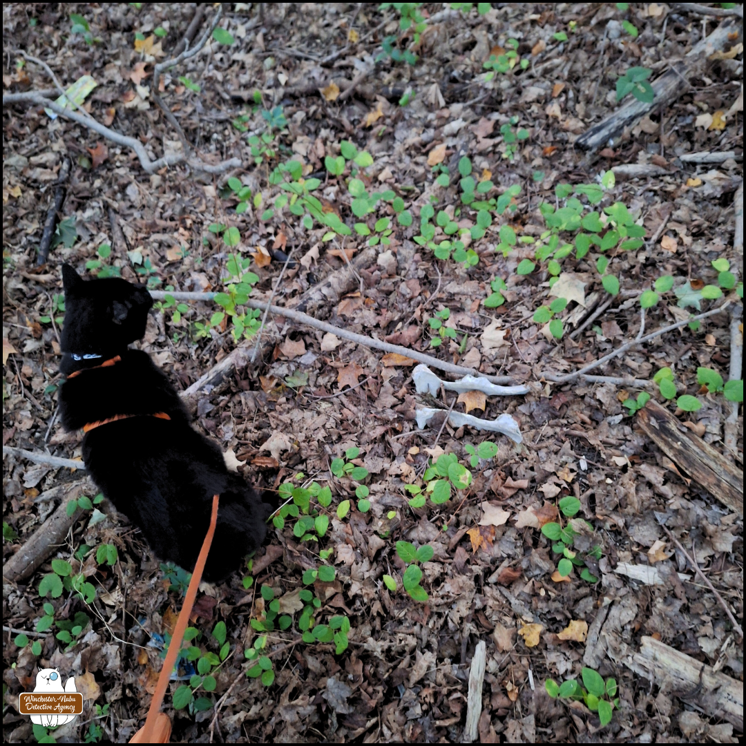 black cat Gus standing in the woods next to a deer pelvis partially covered with leaves