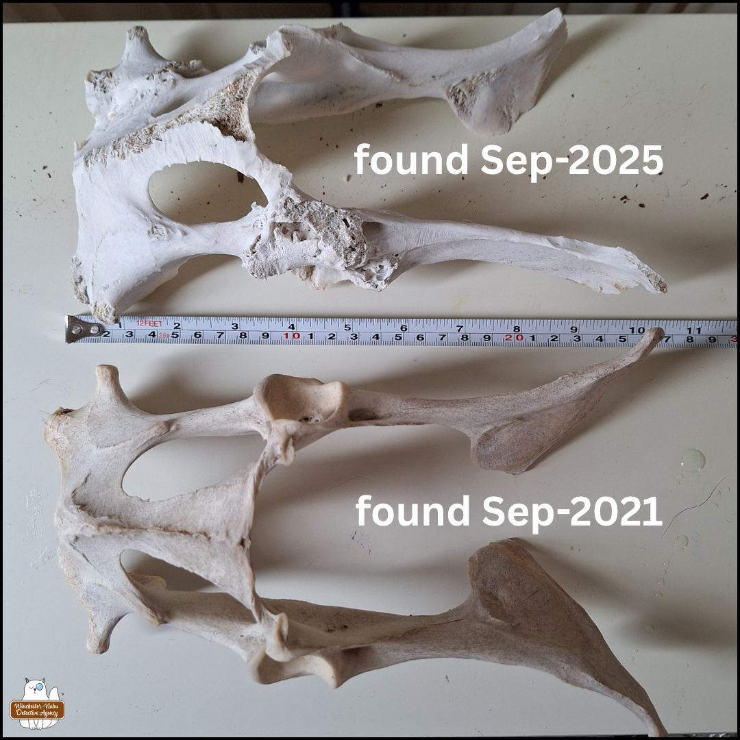 If this pelvis belongs to the same animal as the scapula, it is still possible that the victim was a doe. We know for certain the 2021 victim was a doe, because she had been found quickly after she died.