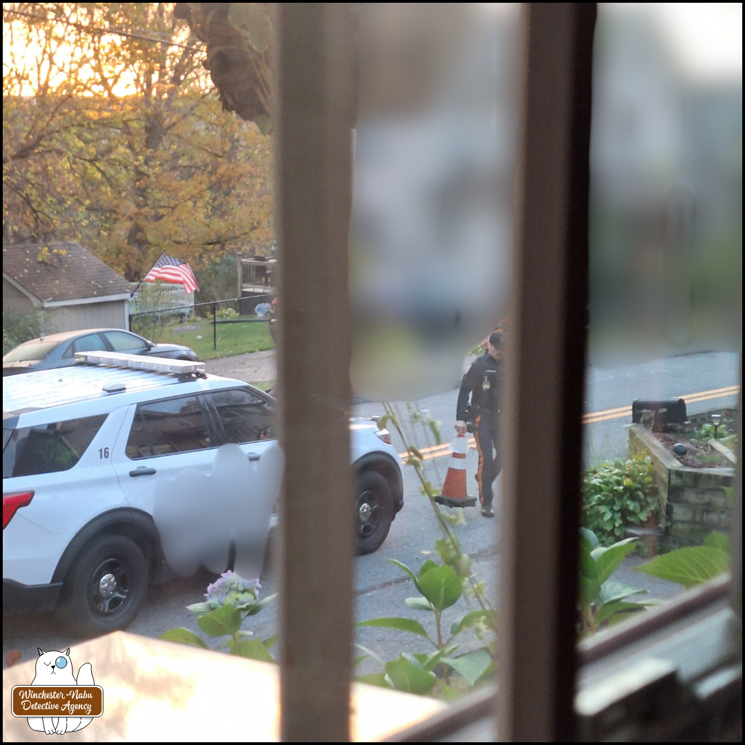 I saw a police car, an SUV technically, stopped in the road blocking the end of our driveway. The officer walked around his vehicle. I noticed an orange traffic cone in the middle of the road and assumed the cop put it there (he didn’t). Gus was still crying. My body felt anxious. What was going on?