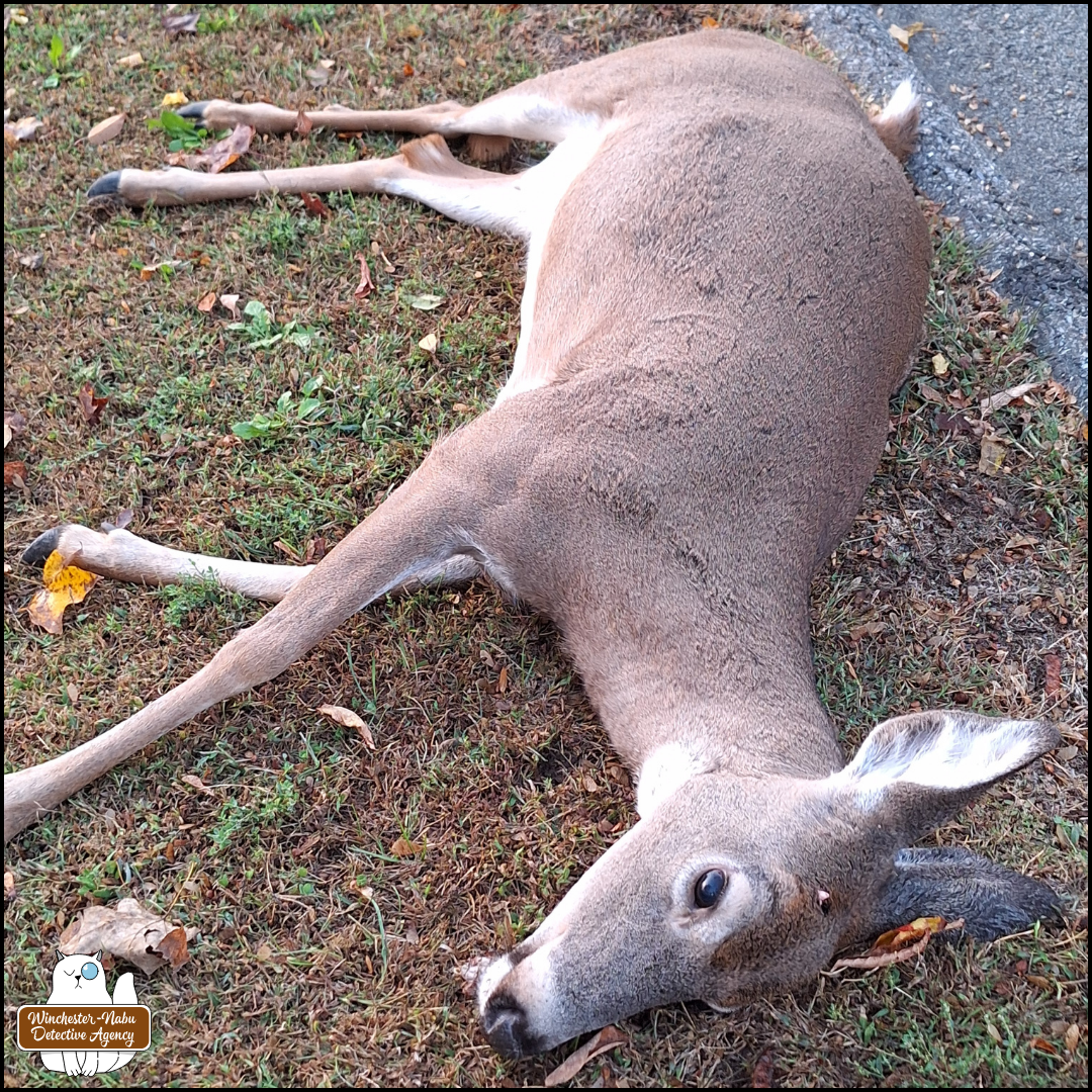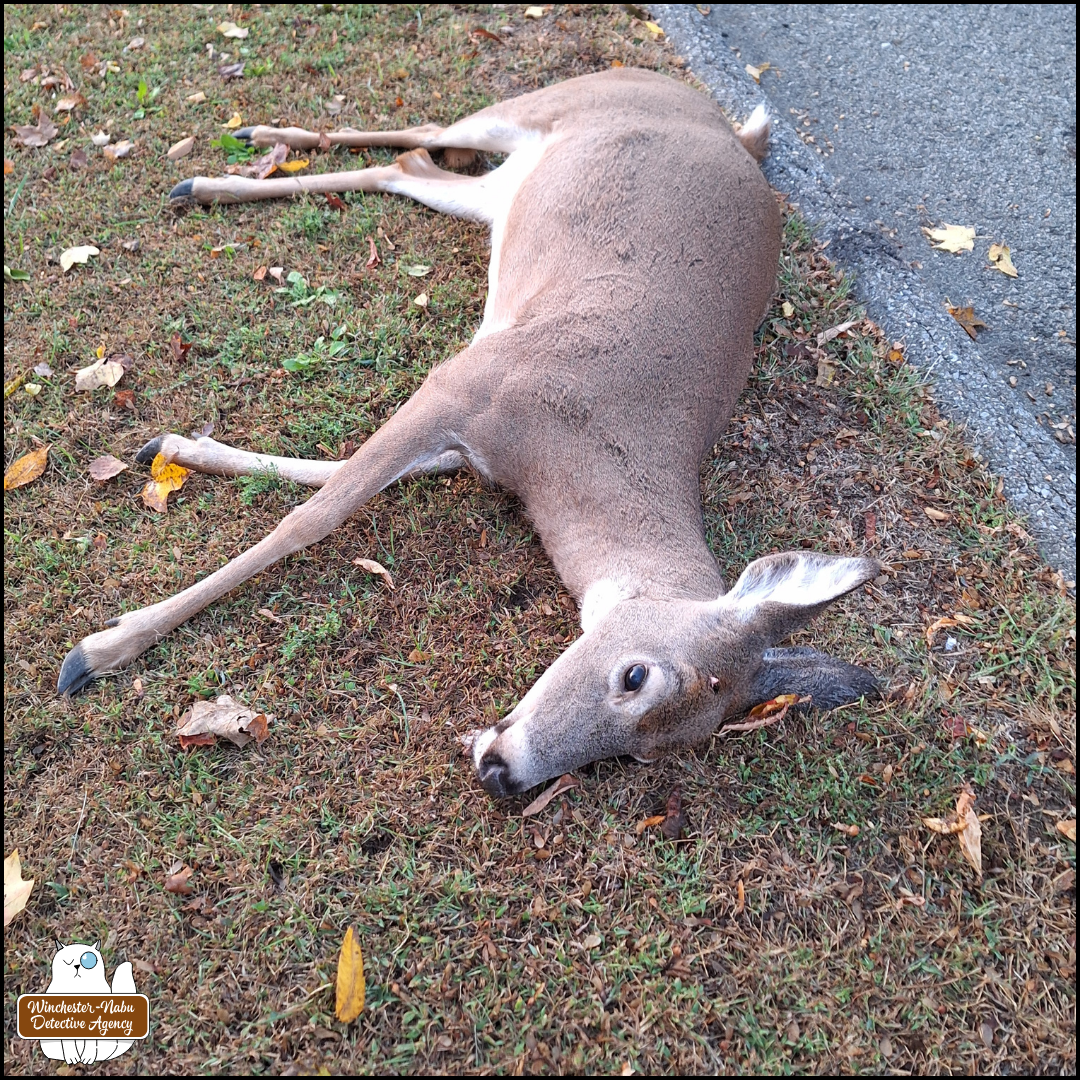 On October 15, 2025, the police responded to a call about an injured deer who was the victim of a hit and run. The officer at the scene shot the doe with one gunshot wound to the head. The officer then dragged the body to someone’s front lawn. That neighbor was the one who initially put the traffic cone out. We don’t have information on whether anyone in that household tried to call for help. We do know that The Wild Man was exiting the private road and noticed her. He called the police.