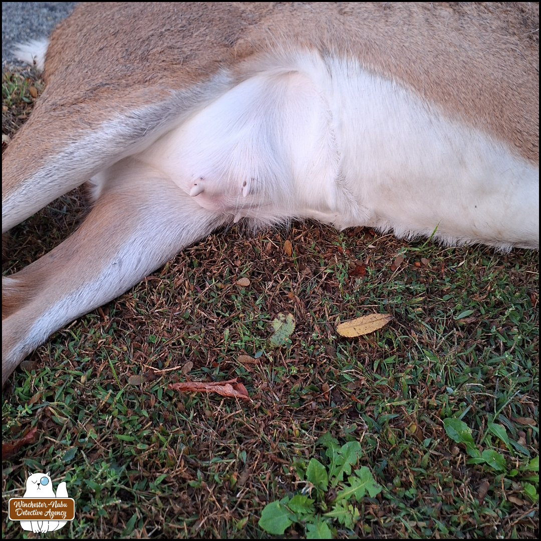 I put a hand on her as I cried. As I felt along her side, that’s when my eyes shifted to her snowy white belly. She still had protruding nipples. She was a mother. Even if she didn’t have milk left, her fawn(s) would still try nursing. It’s what they do at this part of the season. When a fawn goes to nurse, the mother will kick them away. She wants them to be weaned…independent. That’s why wildlife rehabilitation places here won’t take fawns after September even if they have an injury that could be fixed with proper care. Rehabbers here won’t take adult deer at all.