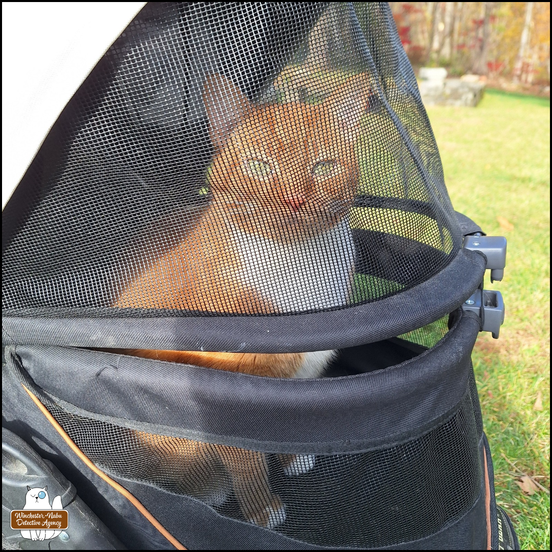 Gus will inspect the scents and objects on the porch whether or not I have to maneuver Ollie’s carriage around complicated terrain next to a busy road. Gus uses his Super Smeller all the time. I’m not sure he can turn off that power. He could be deeply asleep and wake up if someone enters the room with meat. Oliver hasn’t gotten a chance to sniff all around this particular porch, but he has spent time in his buggy sitting out there with his favorite humans. Gus is the one who informed the Grumpy Old Man about the need for cameras and traps there. He’s leary at first when a human approaches, but if there’s a box delivered, that brings him one step closer to identifying them as friendly.