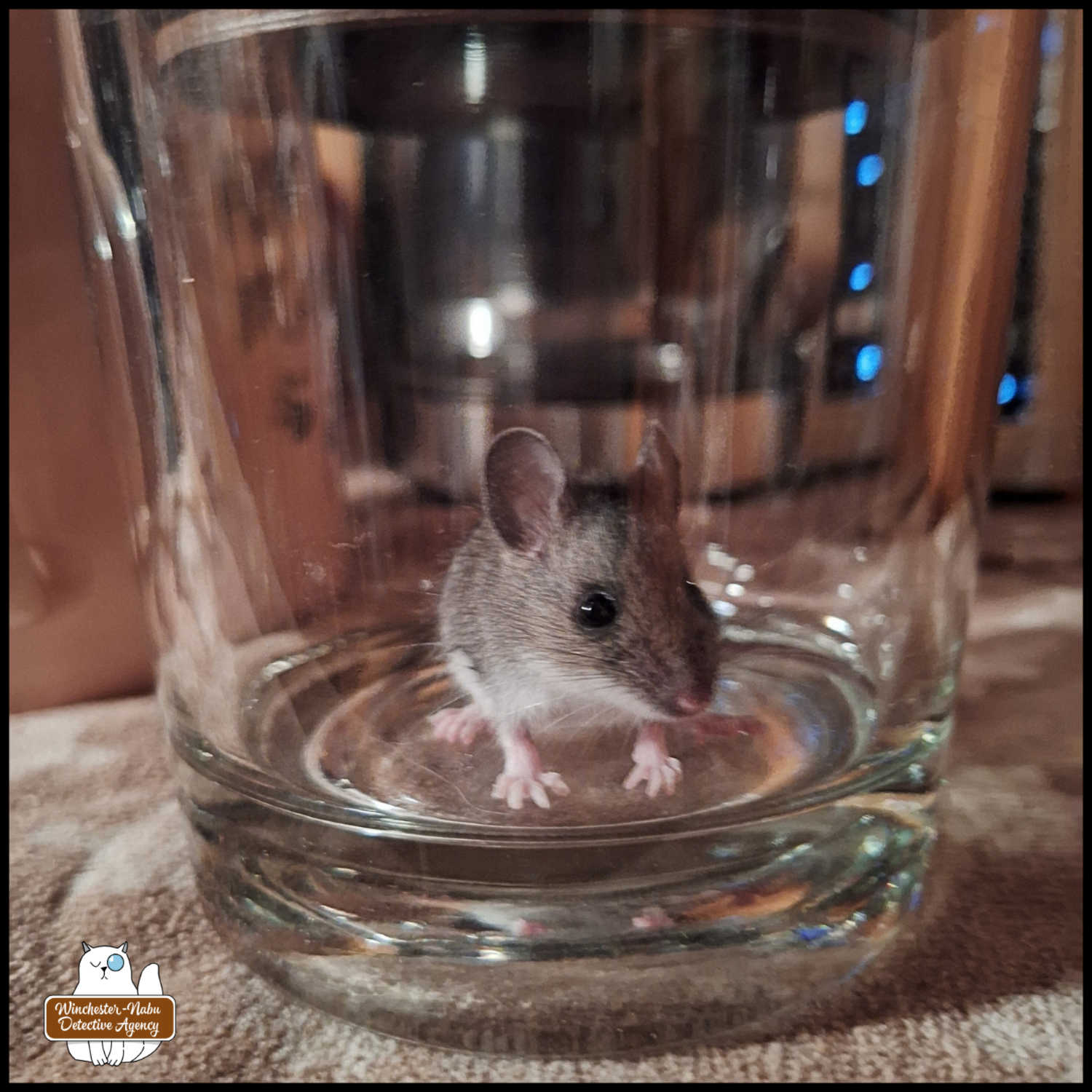 Gus and I reached the living room where Oliver did, indeed, have a mouse in his jaws. In this instance, the mouse barely moved. It made capturing him much easier. Oliver let the mouse go and it looked dead. That offered me plenty of time to place the Witness Relocation Unit over top of it. However, as soon as the transportation vehicle was turned right-side-up, the mouse animated with newly found vitality as if it had been shocked back to life from an AED. It looked fine! Big and shiny black eyes, pink toes and nose, and a snowy white belly. The only thing unusual was the amount of feline saliva on his back giving him that intentionally messy style.