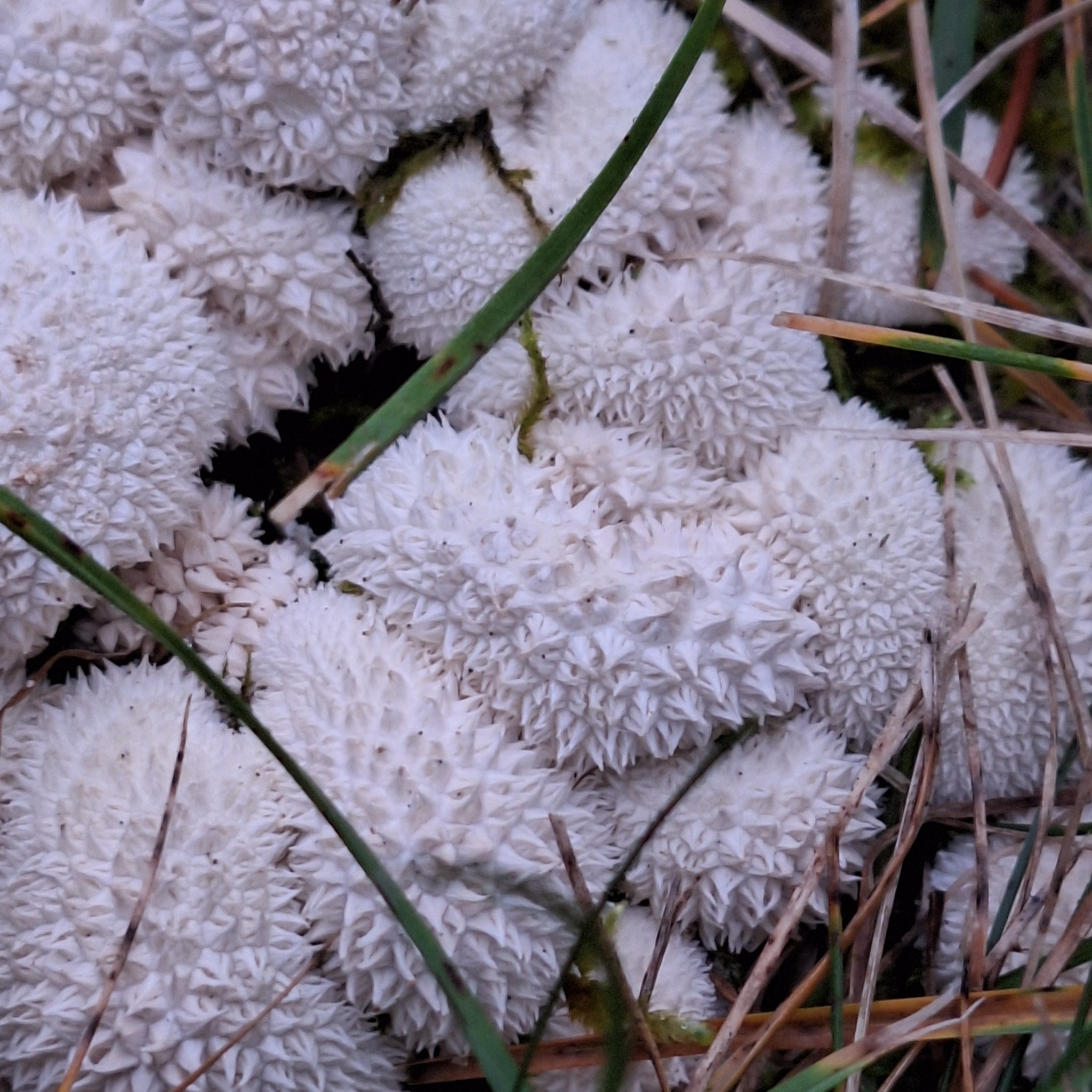 Gus and I walked around until we found what closely looked as described. There were clusters of white spiky balls on the grass. Definitely not deer feces. These were larger and not smooth. The balls also looked like they were stuck together the same way those canned biscuits get in the oven if you don’t have a baking pan large enough for them.