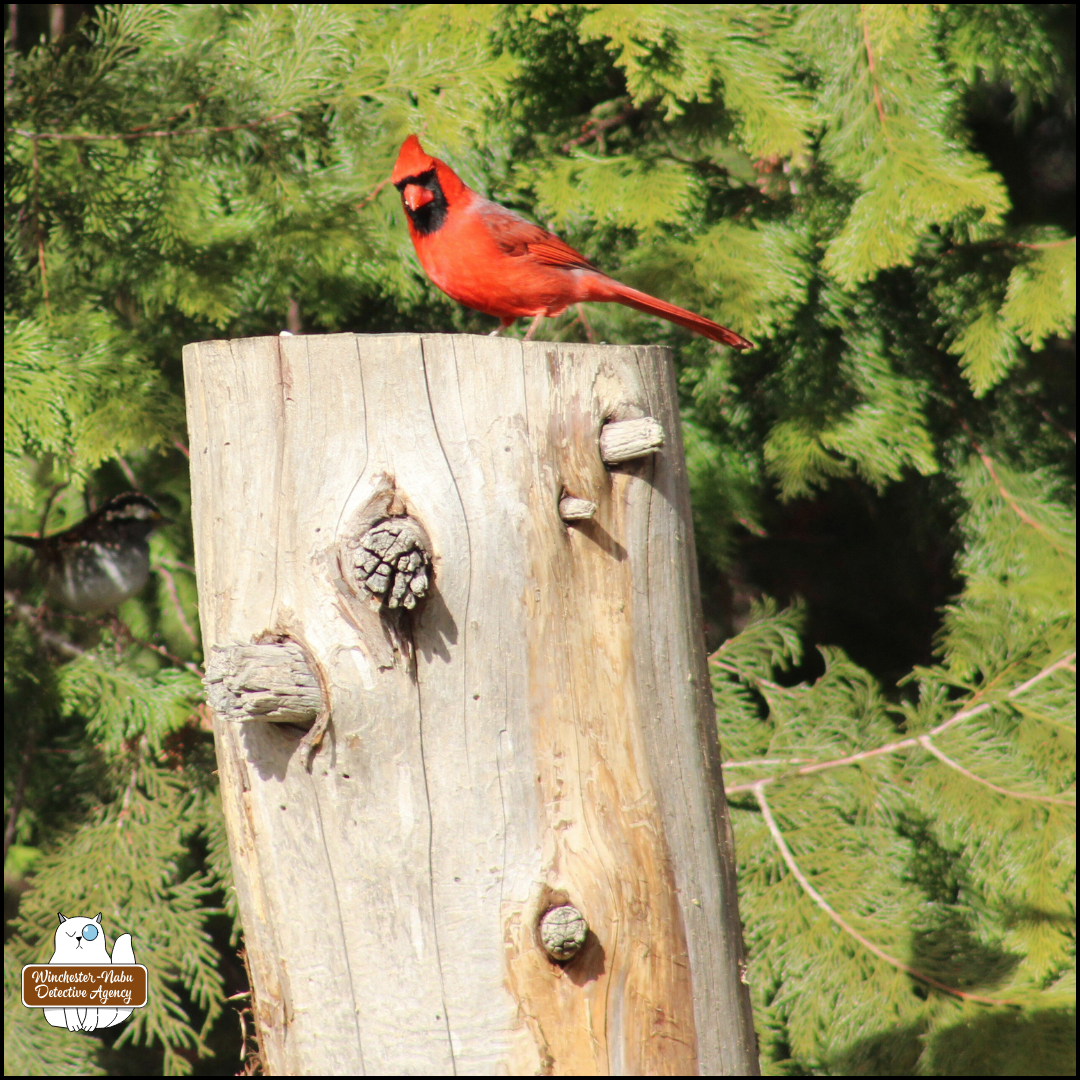 Minnie is the fastest male cardinal that we’ve heard of (although we haven’t actually studied bird flight speeds). Minnie’s speed advantage for the short distances cardinals fly allows him to deliver news and information to other critters who might not pay attention to certain noises/talking.