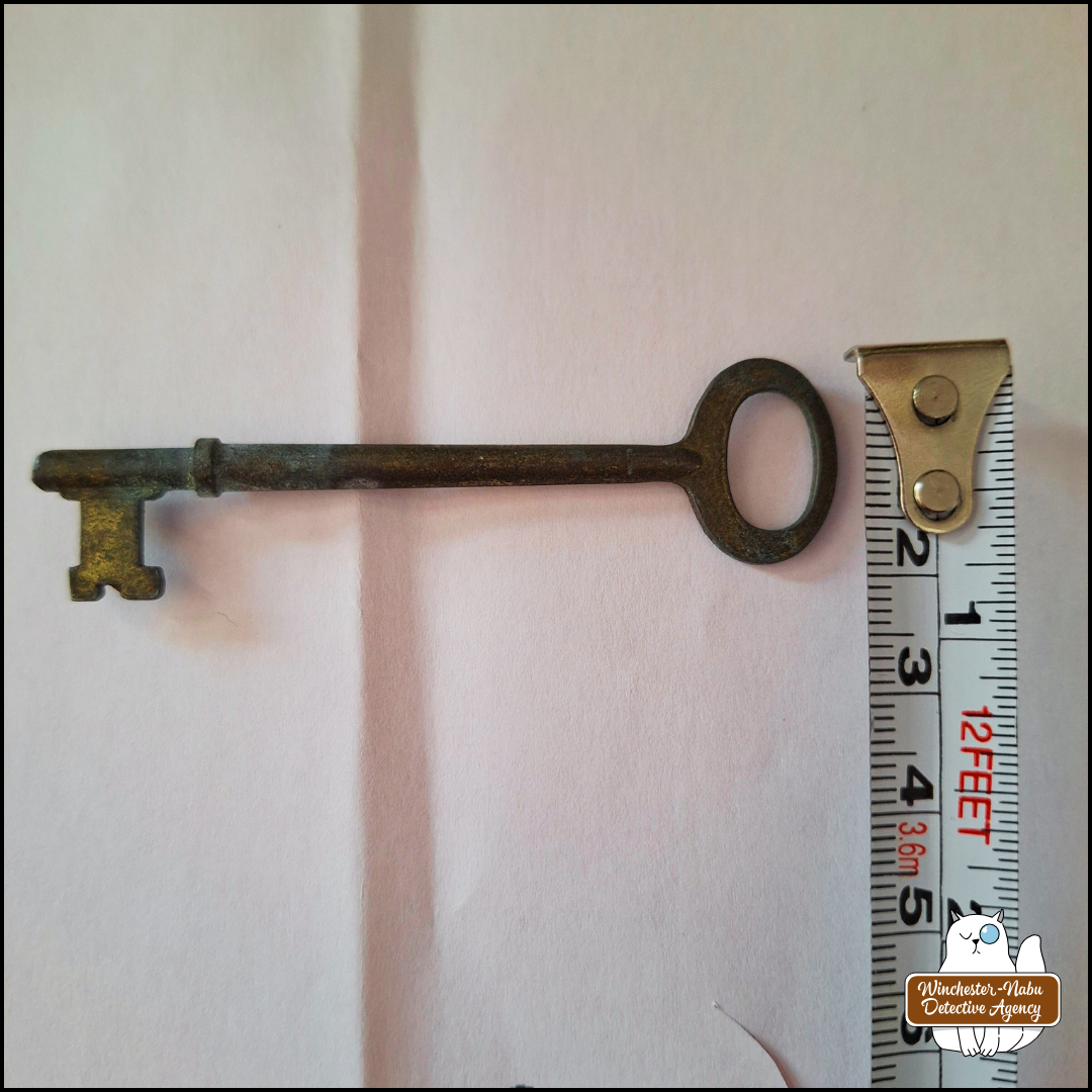 I think they’re fascinating. They weren’t the best way to secure anything, but in a time when it was use a skeleton key or be an expert in complicated wooden joinery, a little key was more accessible. This isn’t the first time the detective agency has had a mysterious key pop up. Back in our fourth year of investigating, a key on a lanyard was found in the back of my car. In that case file, the mystery key held significant importance: